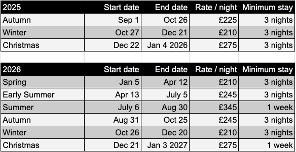 A £150 refundable damage deposit is payable per booking and is paid at the time you make your final payment.